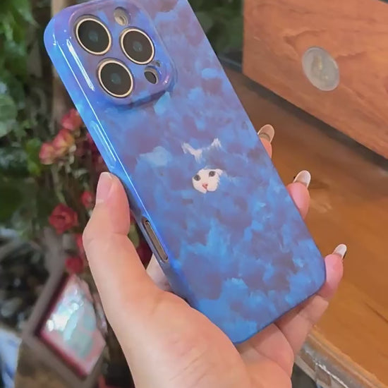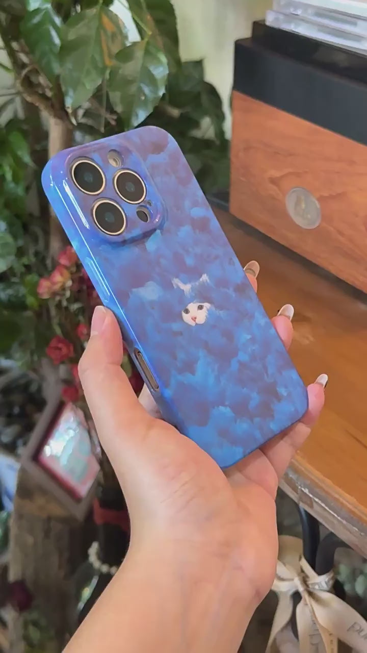 A deep blue velvet–inspired background with a playful peekaboo cat illustration. Soft and slightly mysterious tones blend with a cute hide-and-seek mood, creating a calm yet charming look. Designed for those who love subtle colors with a touch of personality and quiet humor.