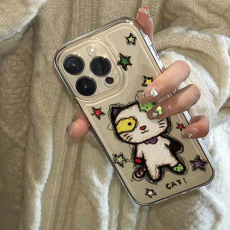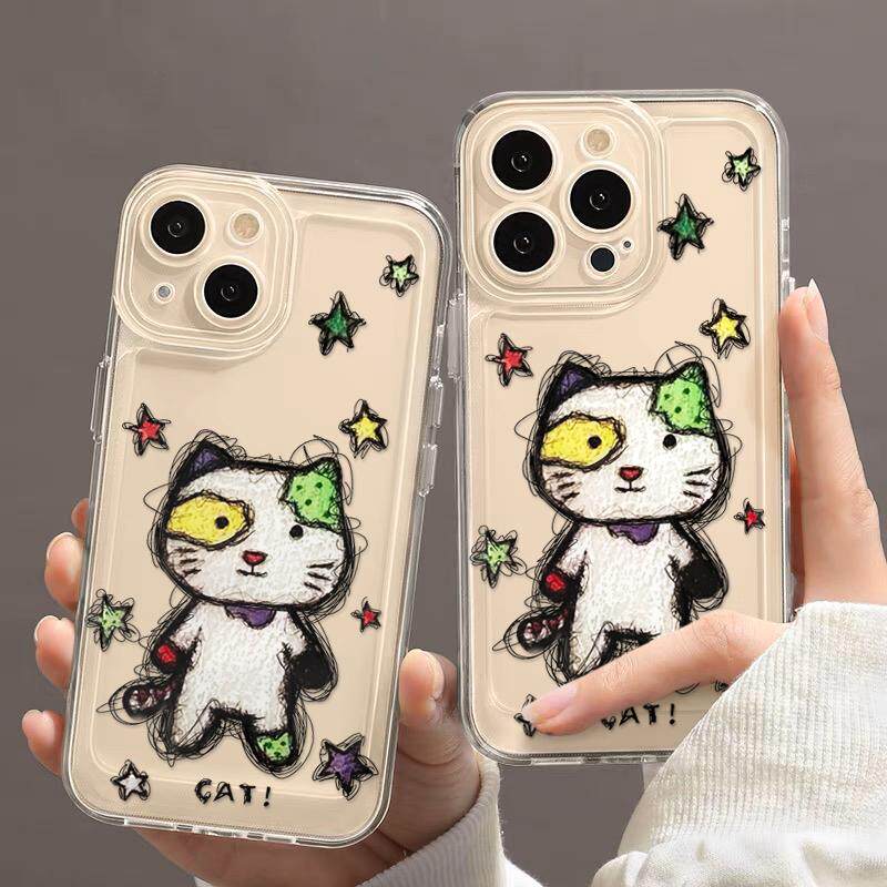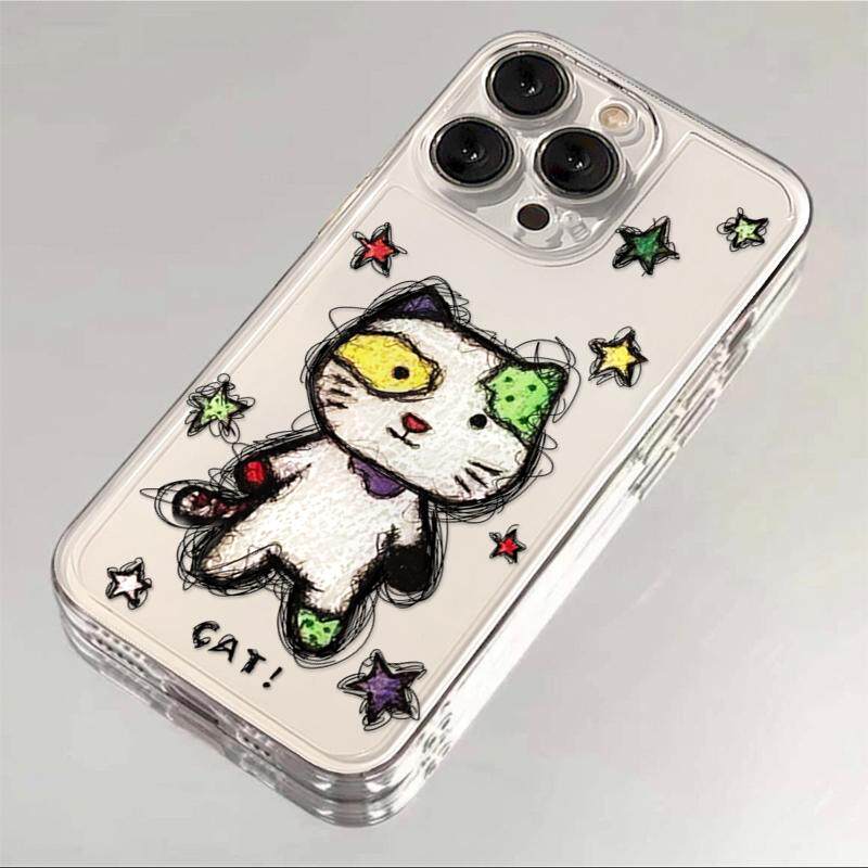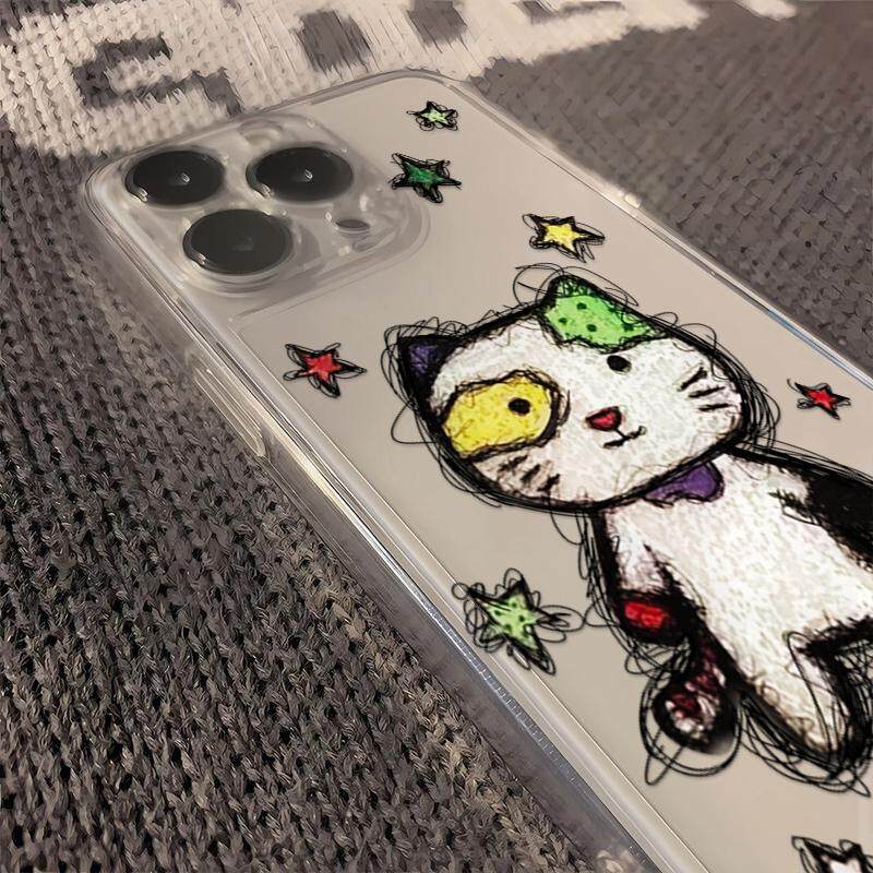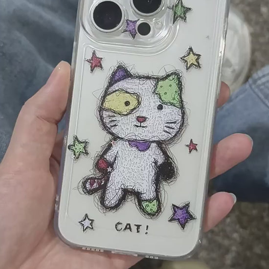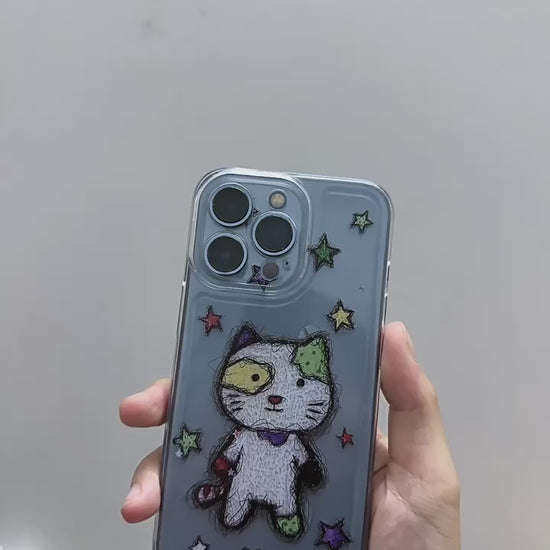 This phone case features a colorful, doodle-style star pattern scattered all over, with a patchwork-style kitty illustration placed at the center. The mix of playful stars and the hand-drawn patchwork cat creates a fun, artsy look that feels lively but still well-balanced. It’s a great choice if you like designs that feel creative, a little quirky, and full of personality without being too loud.